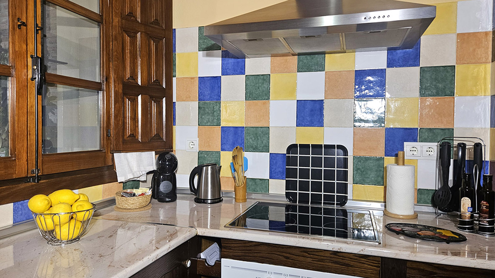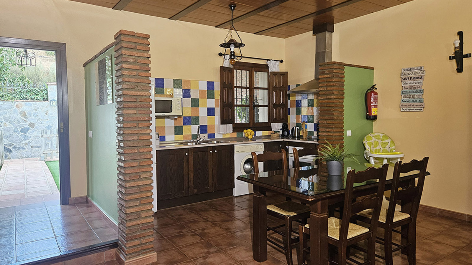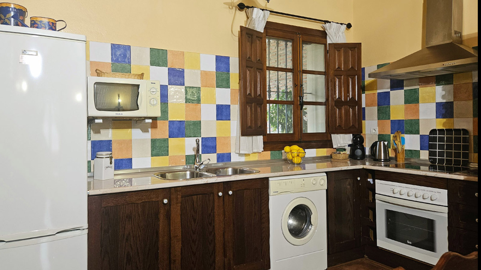 Cocina: Vitrocerámica, horno, microondas, frigorífico combi, lavadora, cafetera y menaje